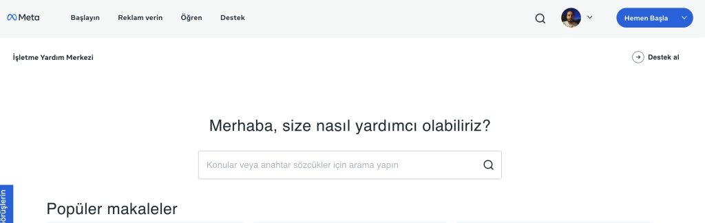 Öncelikle Meta İşletme desteği sayfasına giriş yapın. Sizi aşağıdaki ekran görüntüsündeki gibi bir sayfa karşılayacak. Burada sağ üstte “Destek al” düğmesine tıklayın.