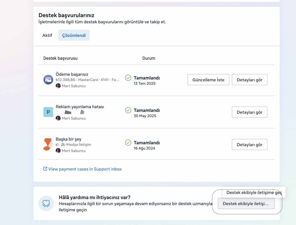Açılan sayfada aşağıya inin. Aşağıdaki ekran görüntüsünde yer verdiğim ve kutu içine aldığım: “Destek Ekibi ile İletişime Geç” düğmesine tıklayalım. Ardık destek almaya hazırsınız. Tüm bu karmaşa ile uğraşmak sizin için zorsa bizimle iletişime geçin size en kısa sürede destek olalım. Bize Instagram‘dan veya WhatsApp üzerinden ulaşabilirsiniz. Yada site üzerinden iletişim formunu doldurabilirsiniz.