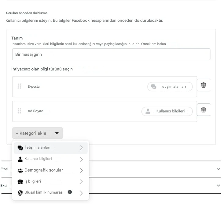 - Otomatik doldurulabilen sorular kullanın: (ad, soyad, e-posta, telefon) → Meta profilden çektiği için kullanıcı uğraşmaz.