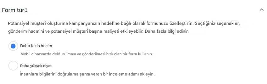 Meta Lead reklamlarında yeni bir form oluştururken ilk soruyla karşılaşırsınız: